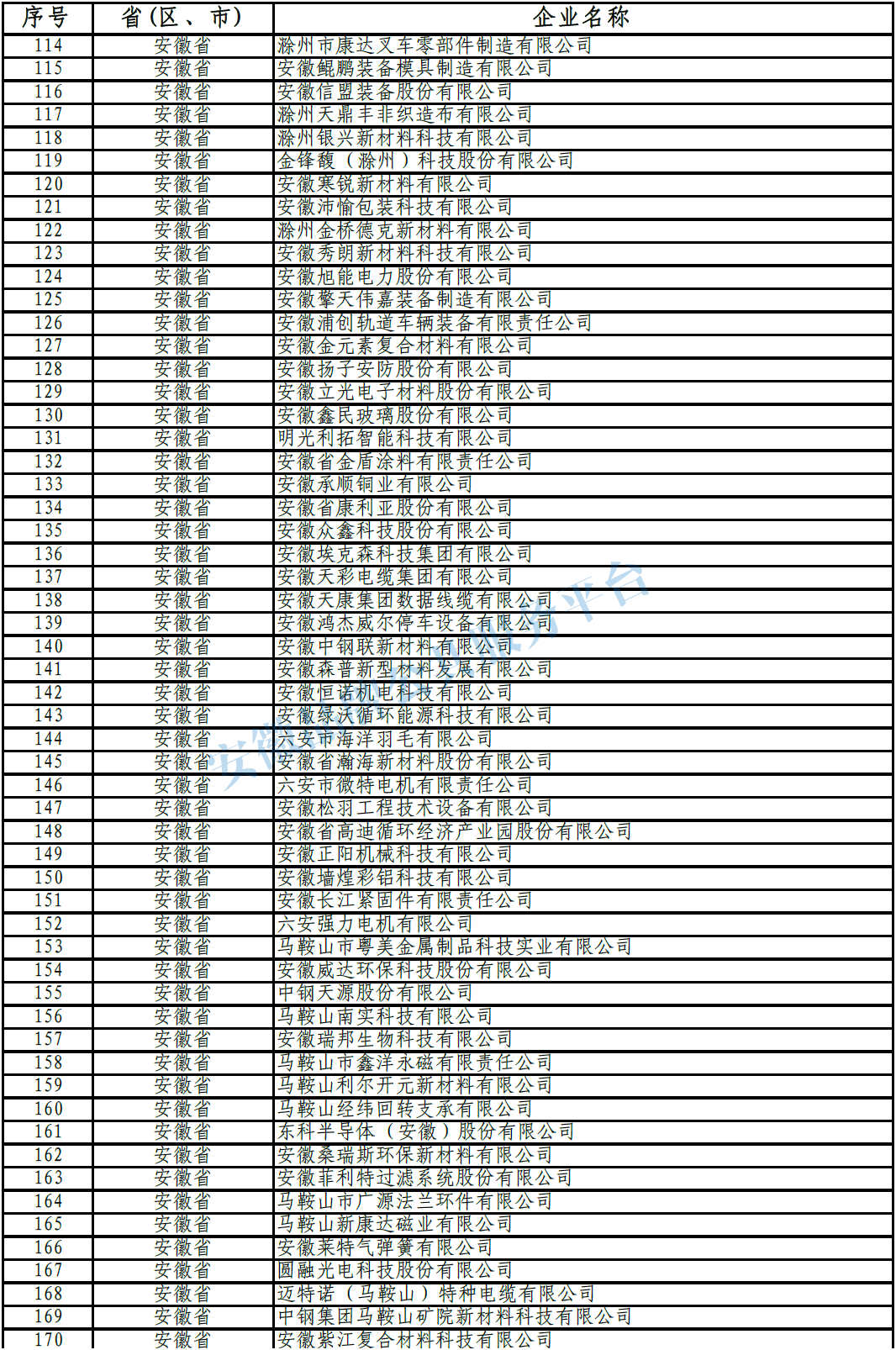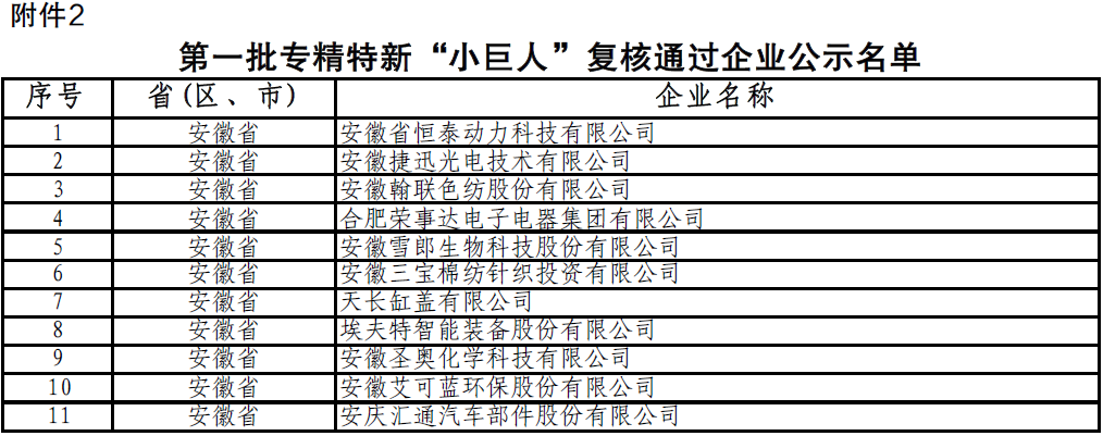 为深入贯彻习近平总书记关于“培育一批‘专精特新’中小企业”的重要指示精神,落实中办、国办《关于促进中小企业健康发展的指导意见》,工业和信息化部开展了第四批专精特新“小巨人”企业培育和第一批专精特新“小巨人”企业复核工作,已完成相关审核,现将我省通过审核的企业名单予以公示(见附件1、2)。此外,有部分已认定的专精特新“小巨人”企业进行了简单更名,一并将经申请并通过审核的简单更名企业名单予以公示(附件3)。